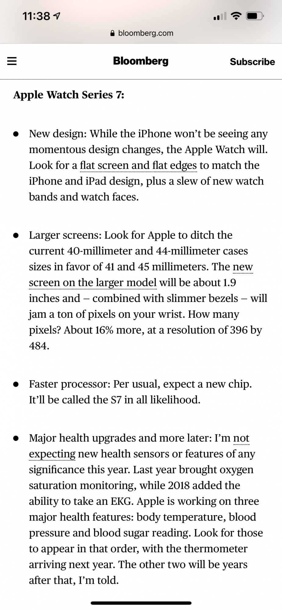 I agree. Same SS Series 4 and the change in form factor is a plus, but without anything else I’m hesitant. If temperature check alone is pushed back a year that means other medical apps are too. Not that I’m itching for temp., blood pressure, hydration or blood glucose, but their inclusion (one or more) would be an additional push over the edge to say “order this one” as opposed to waiting for a Series 8 or later (which according to some reports will have some or more of these features).I currently own a SS Series 4, was really hyped about the upcoming S7, and was ready to preorder, but if the latest rumors about the design not changing are true, I will probably hold off upgrading for another year. Also the lack of new sensors.... the only thing I'd be upgrading for at this point, would be the Always on display. Not really worth it. Let's see..