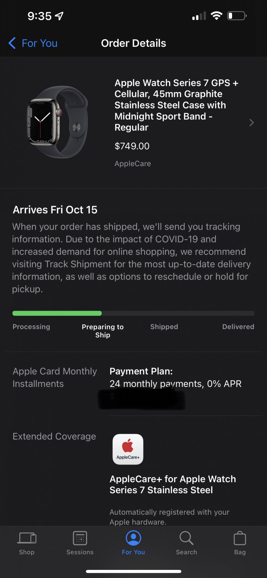 ordered around 5am PST, then redid my order around 9am after choosing incorrect band, upgrading from S3 to 45mm S7. status in processing and estimated order arriving Nov 2 - Nov 9