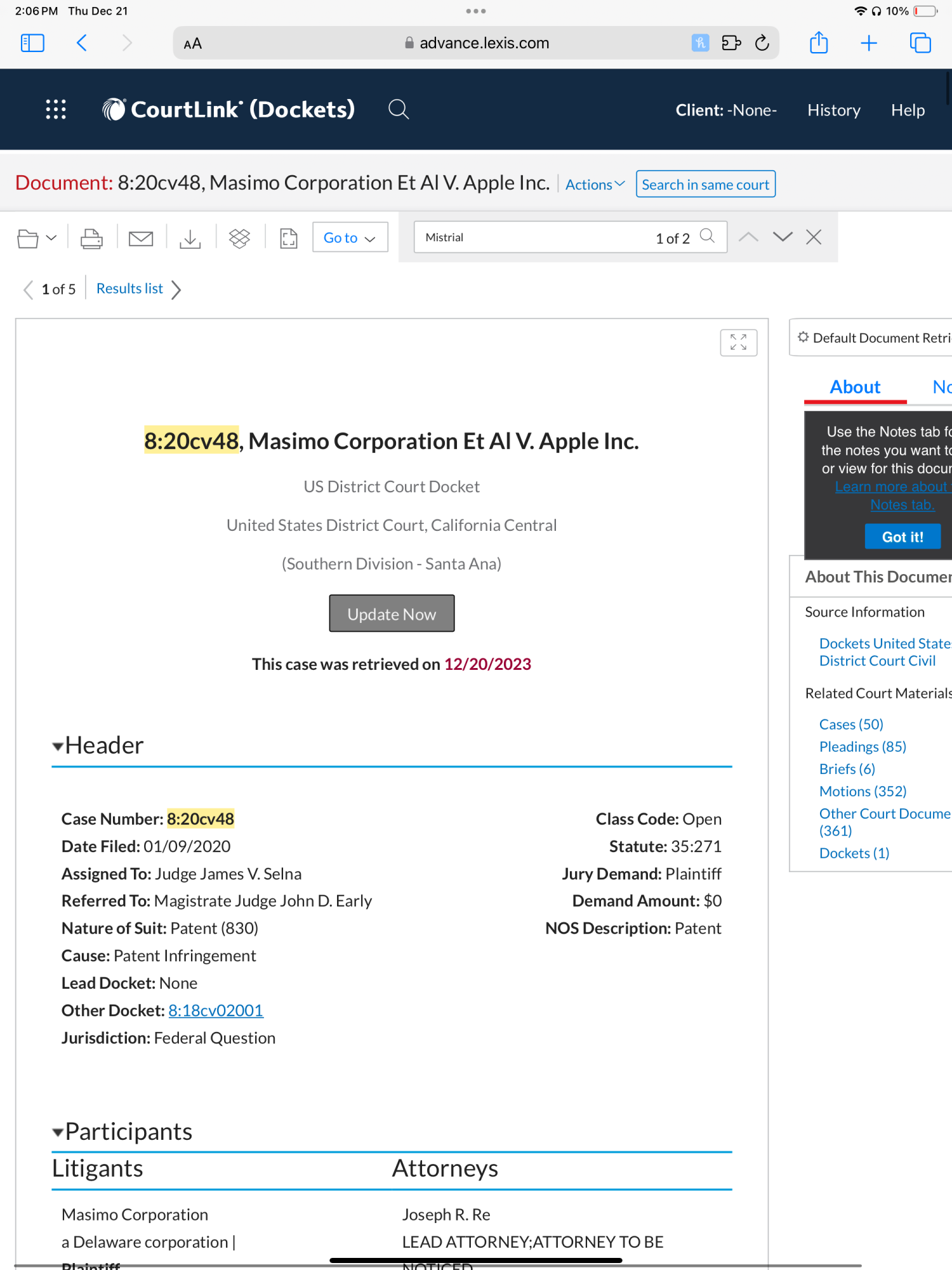 This is the original case is Masimo Corp. v. Apple Inc., C.D. Cal., No. 8:20-cv-48
