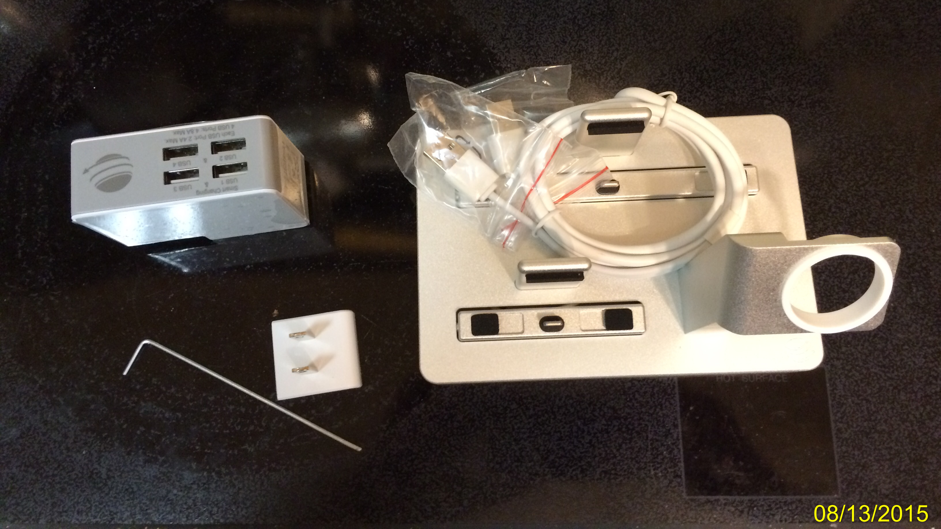 I received two W3 mahogany units. I love that the mahogany is a solid piece and not veneer. Overall I love them but there were issues. On both units ALL screws were loose. One unit had one screw that had come out. I found it in the box. The other unit had several screws that had come out and a small metal plate had come off. I suggest everyone remove the bottom plate and check all screws. My bottom plate screws were loose too. This is my first time posting photos so I hope it works. The images show the insides before repair. Note missing screws and missing plate to hold in rotating charging bar. Finally there is a picture of the unit with phone, iPad and watch.