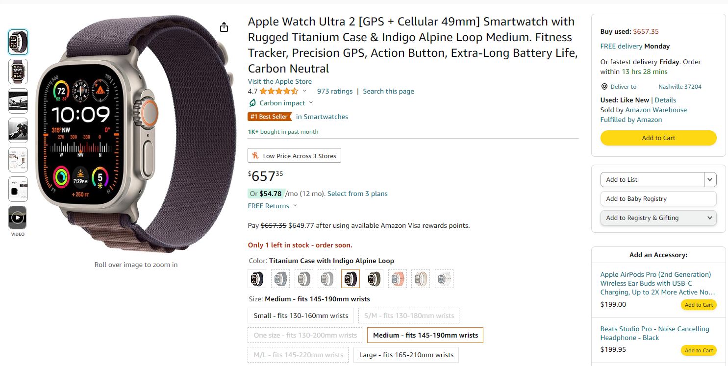 Amazon provides an estimated delivery date of Friday for free delivery, although Prime members should get it by Thursday. This deal beats the previous all-time low price by nearly $60, and also beats many of the deal prices we've seen recently on the first generation Apple Watch Ultra.