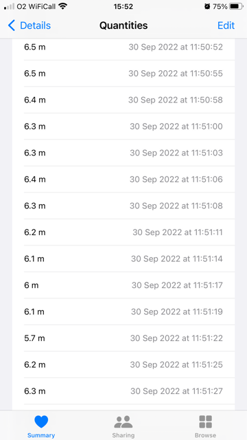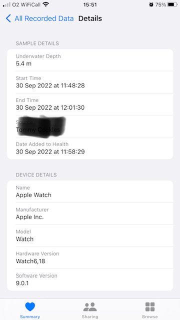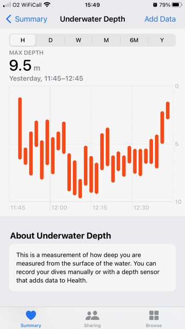 The depth figures were in line with the Stinger and seemed to be recorded every 2 - 3 seconds whereas the Stinger is only every 20s. However to view these you need to look at the Health app. Even then, there is just a list of figures - no visualisation of the profile which would be much more useful. I haven't yet worked out how to export these fgures from Health to something that can produce a graph.