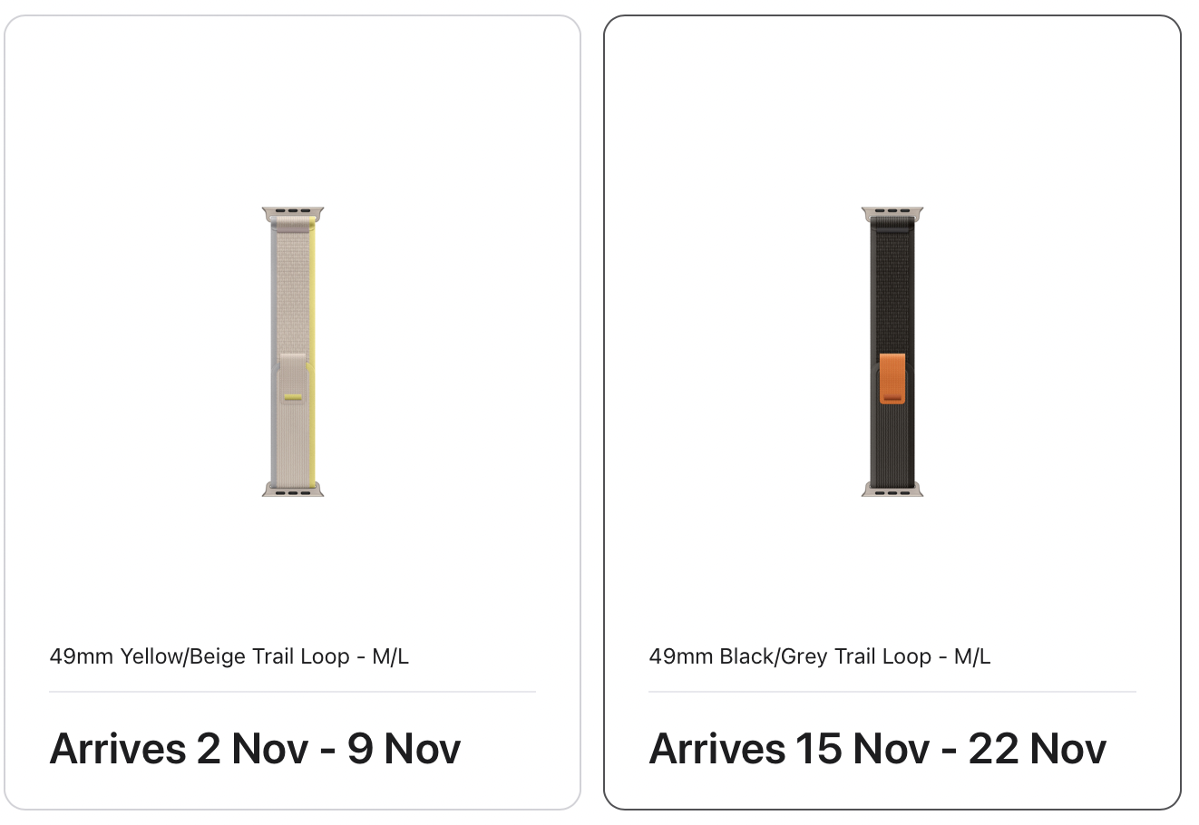 In the UK it’s mid to late December now but most other bands seem readily availableSo I ordered a black/grey trail loop last week and it was gong to be delivered 15 Nov to 22 Nov