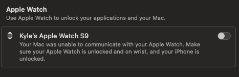 - Toggled Unlock with Apple Watch on Mac, restarted Mac, turned feature back on