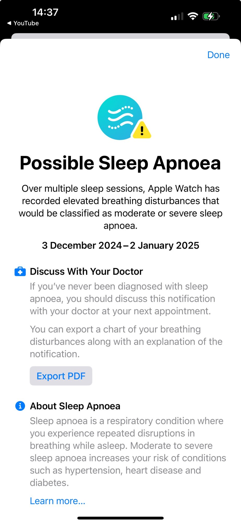 Apnoea, interesting .... lolI’ve suspected for years that I may have sleep apnoea, but my watch s10 finally gave me the kick I needed to go see a doctor about it. Got given a diagnostic kit to sleep with overnight and although I haven’t got the results yet, I did get an email today saying that I should call them for the results and until then I’m prohibited from driving a car 😂 so clearly there’s something there. (Not actually a problem in my case, no car, no license).