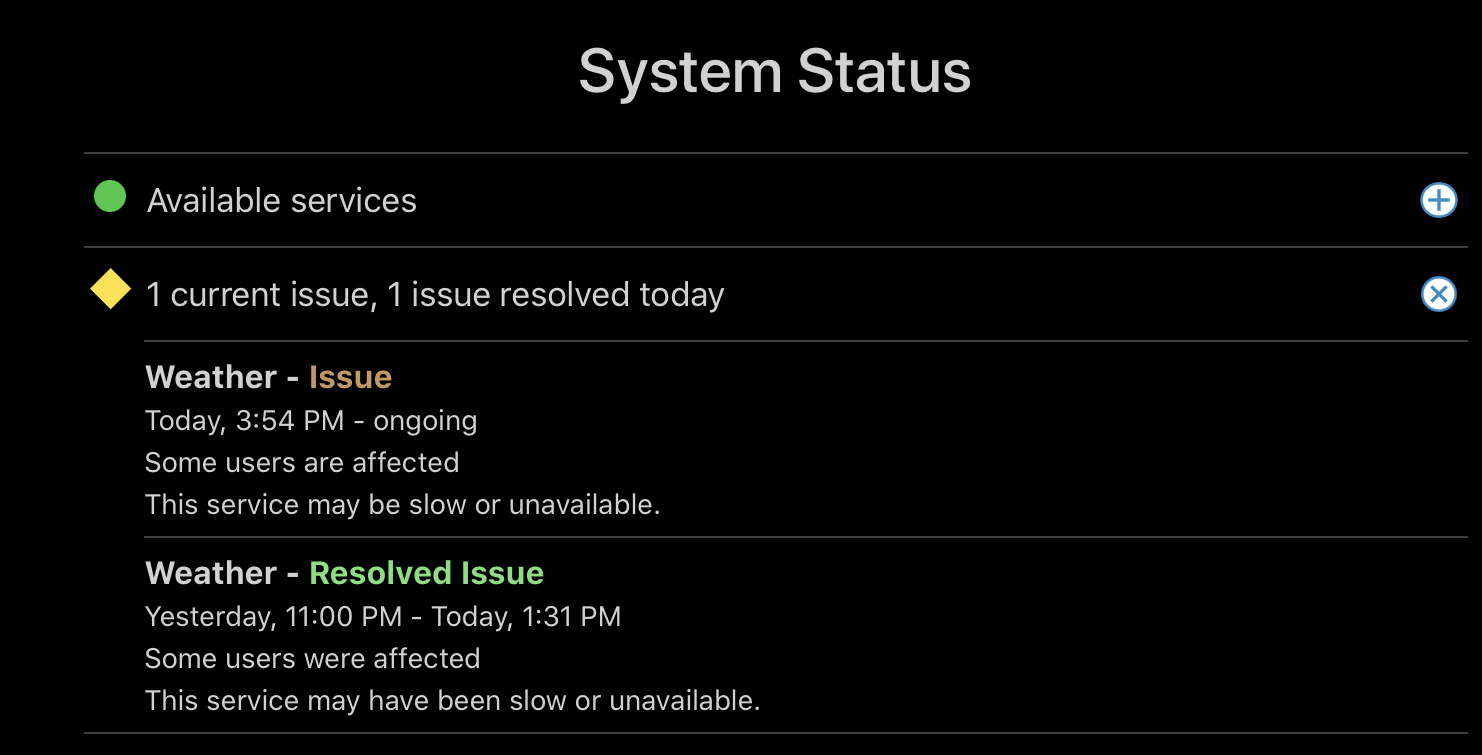 Apple is currently trying to resolve an issue with its Weather service according to its System Status webpage, although the issue summary only lists next-hour precipitation as unavailable for Alaska "due to a data provider outage," when in fact numerous regions and forecast types are down.
