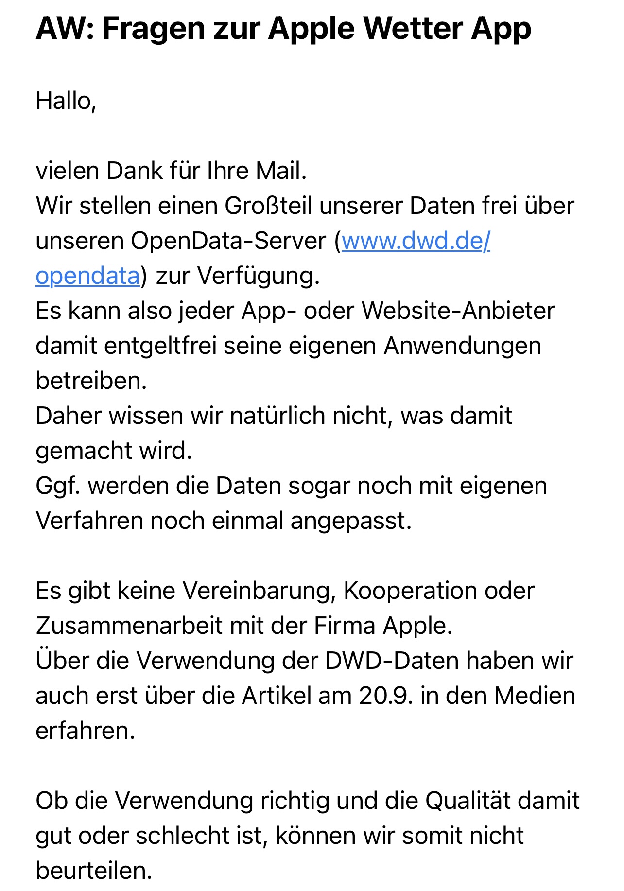 I can’t believe that Apple says that they are using „DWD - Deutscher Wetterdienst“ as the source. The DWD app shows much different data to me.