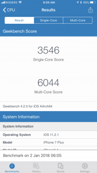 single (3576) multi (6029). So I was blaming to iOS 11 , however the case of slowness is connected with the battery. I have lost up to 35% of the performance. So I am highly recommend either stay on 10.3.3 or upgrade to iOS 11 but change battery to get full performance. I will try to exchange battery after holidays