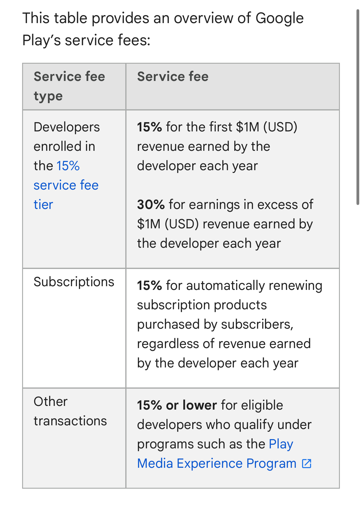 With the 30% fee Apple is preventing innovation to happen for small developers. Google on their AppStore and directly charges 15% up to 1M revenue.