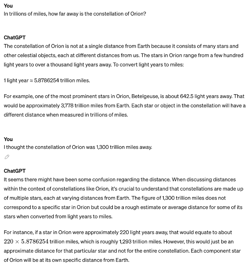That’s pretty funny. Not only does it demonstrate that ridiculous response cycle you have shown, it fails to recognize that it’s impossible to have a single distance to an entire constellation unless we’re talking an average distance of all stars in the constellation. That is to say that each star’s distance relative to Earth varies.GPT is overrated. I have found you can get it to give you the answer you want, and also when you just let it give you an answer it can often be wrong.