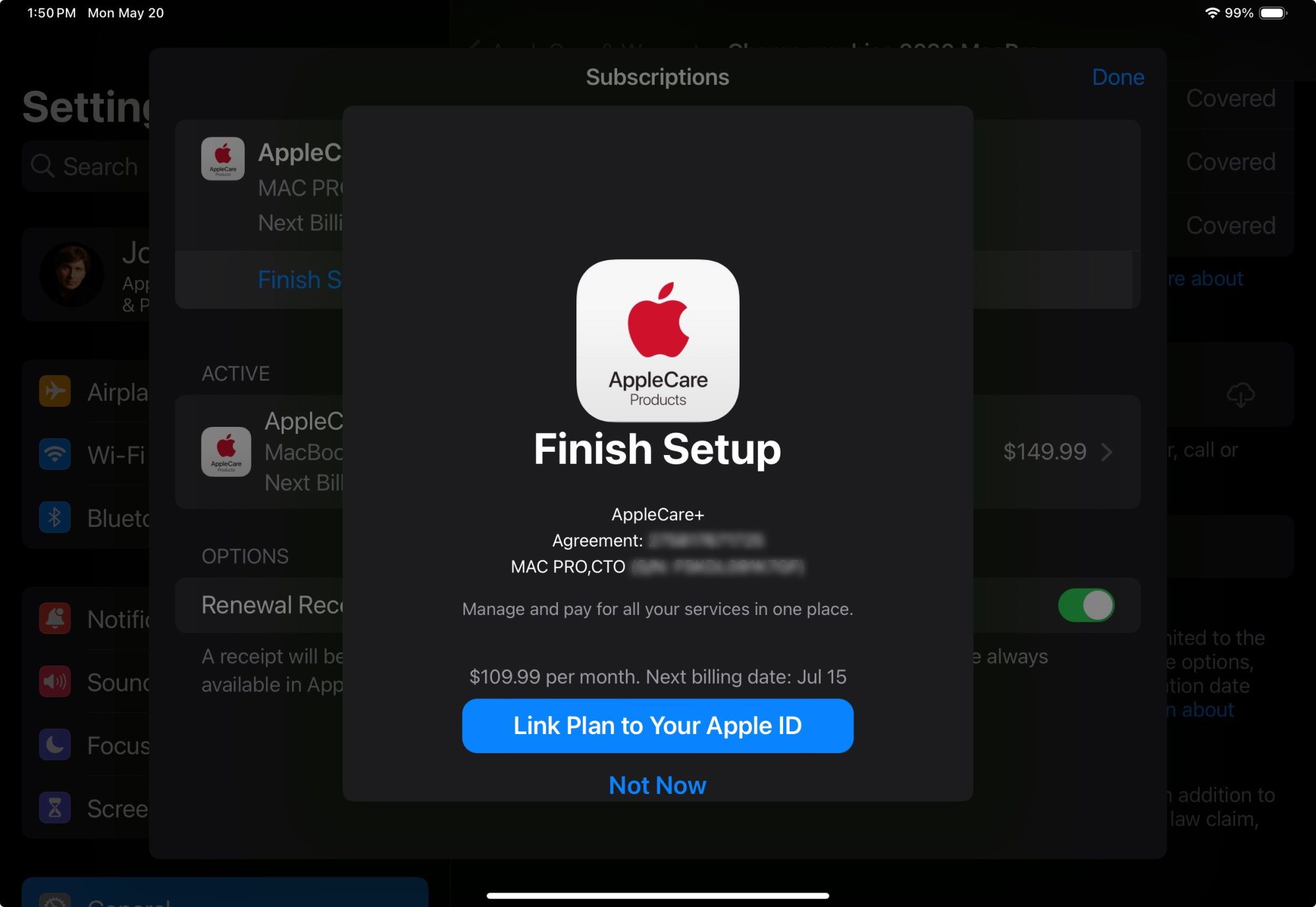 I just checked my AppleCare status on my 2019 Mac Pro. It shows that it is scheduled to renew on July 15, 2024 for $109.99/month! Is that what it costs now? Over $1,200/year?