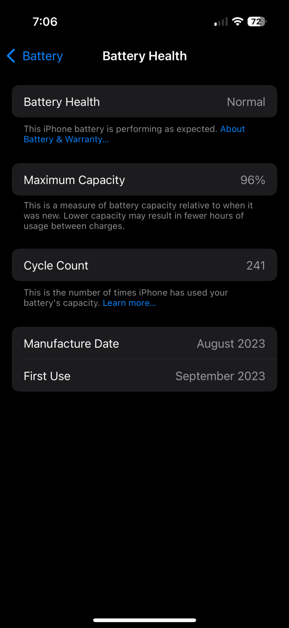 I've had my 15 Pro since a day after launch, used the 80% on and off for most of the year, and I wireless charge overnight. 96% and 241 cycles. I switched it to 90% limit when iOS 18 came out and I'll probably keep it there.