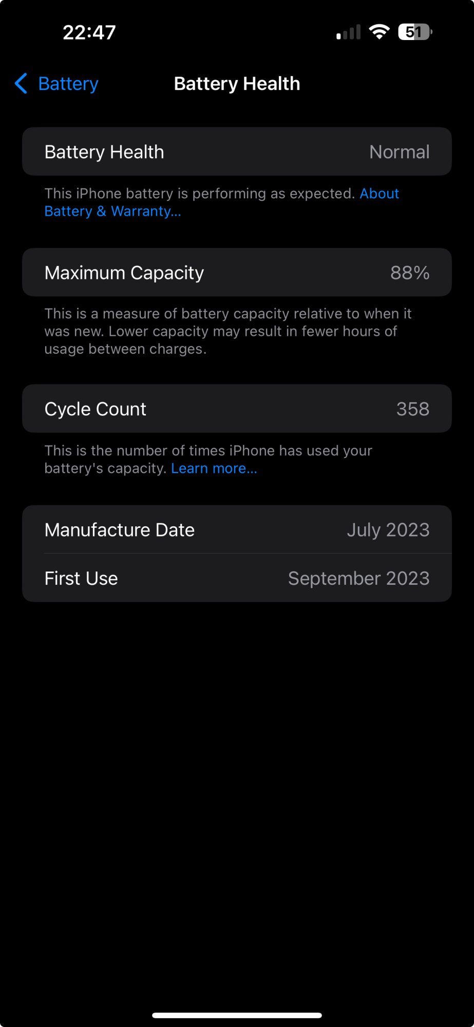 Meanwhile, I've never limited the charging of my 15 Pro Max's battery, and after 358 cycles (of I'd guess mostly wireless charging) and very intense daily use since basically Day One, its max capacity is still 88%. So after a full year, I'm still getting more than anyone who's been limiting themselves to 80%—especially if we ignore the degradation of their own batteries, which lessens what their 80% actually means—and have enjoyed longer battery life the entire time.