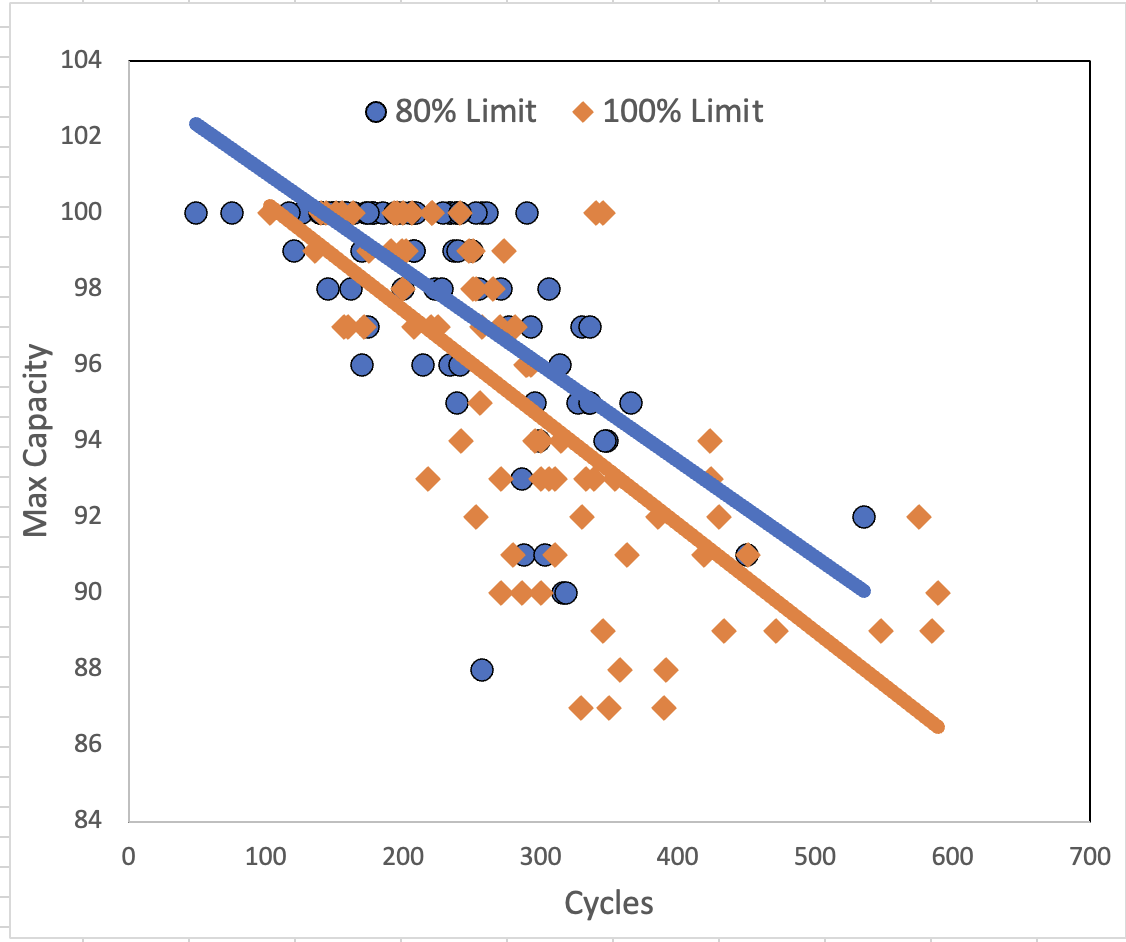 Hello, well, limiting the load to 80% from the first day is working for me. I have had an iPhone 15pro since launch day and with 290 cycles it is still at 100% of the useful life.
