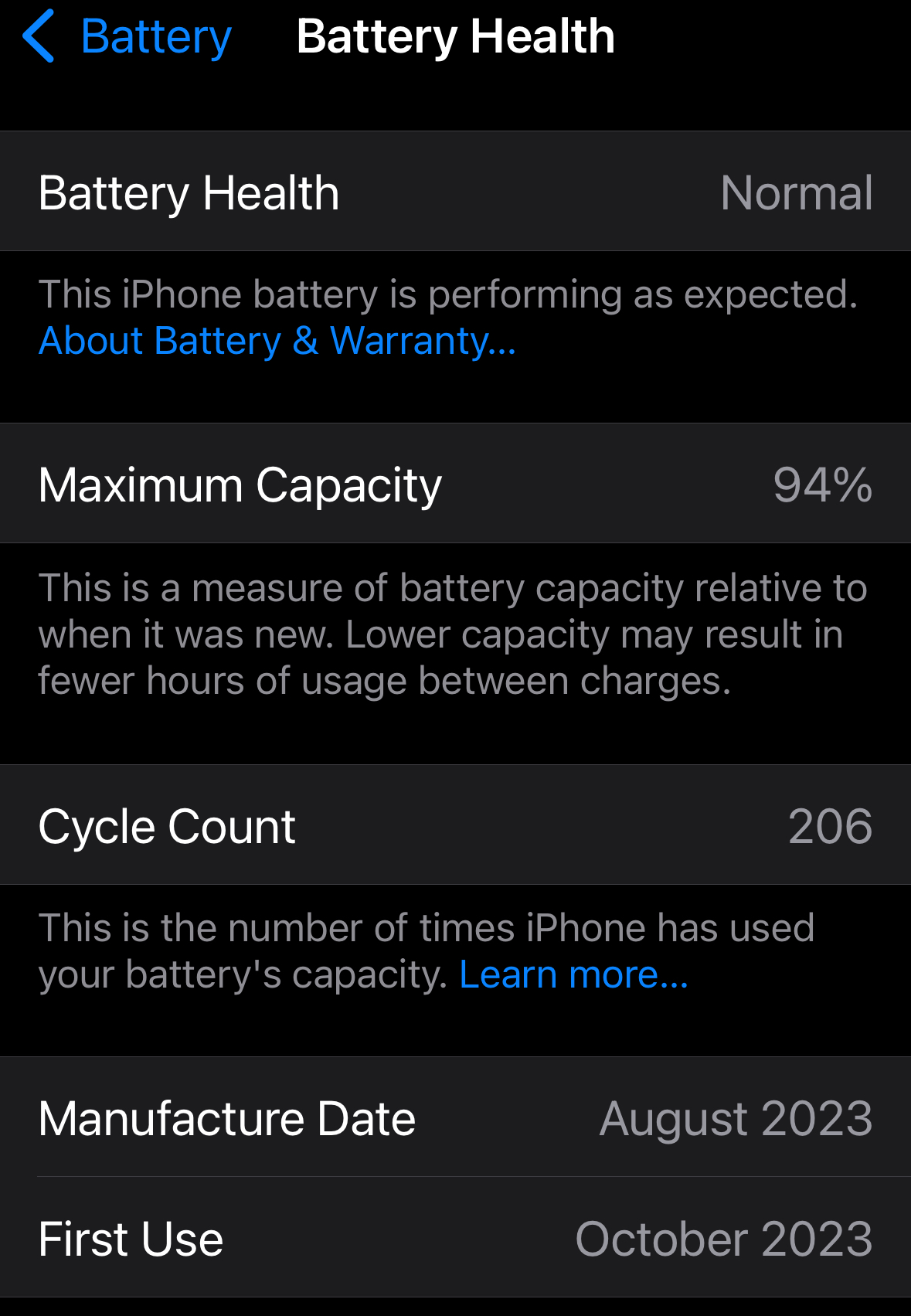 My iPhone 15 Pro Max battery level is currently at 94 percent with 299 cycles. For a lot of 2024, my battery level stayed above 97 percent, but it started dropping more rapidly over the last couple of months.