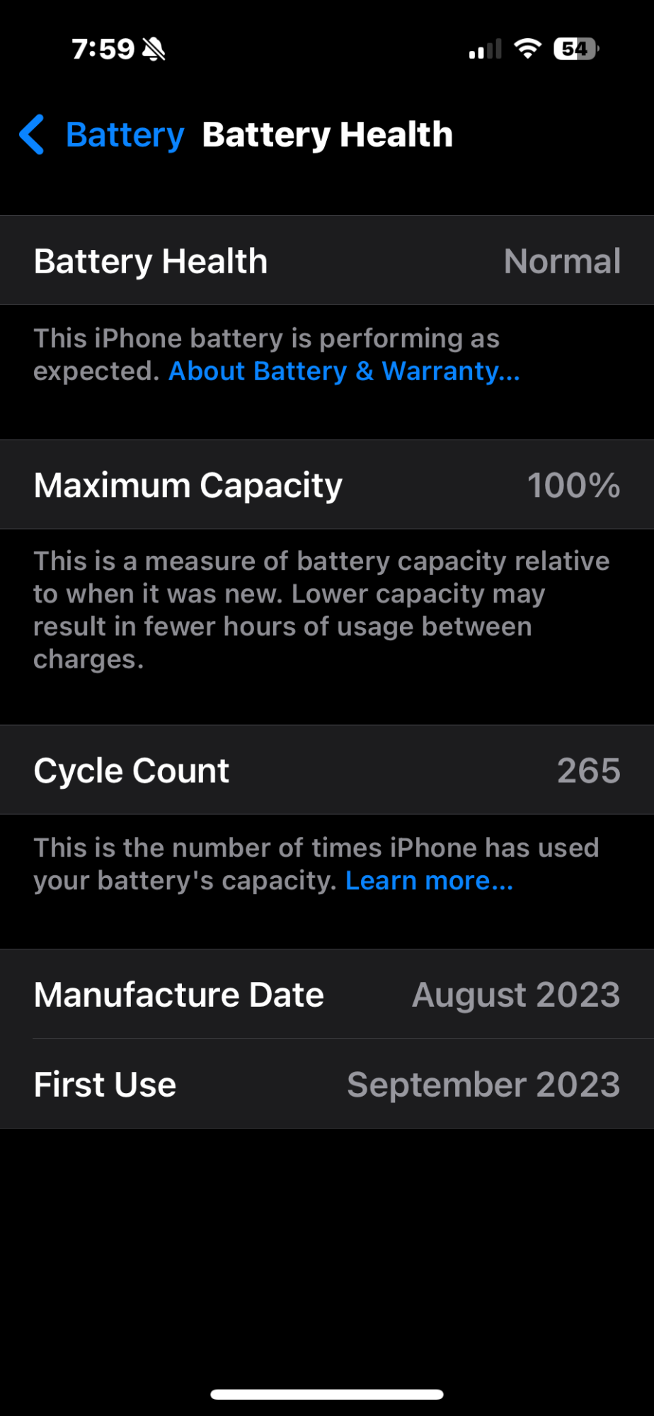 Seems almost impossible to still have 100% battery health after a full year. Based on your 1st year, will the 2nd year still be 100%? 3rd year still 100%? I mean, if a year and 265 charge cycles doesn't drop your battery health,, what will? And why is yours so different that everyone else?I keep my phones for years so have been pretty compliant with the 80% charging method, mostly USB charging, little MagSafe. It seems to have worked pretty well for me. View attachment 2429689