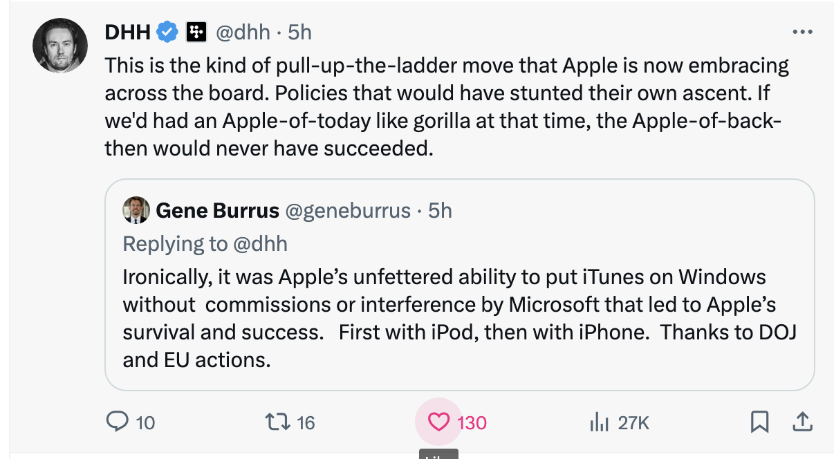 It's why I call the app fee a rev share model. Apple incurs the risk and upfront capital, takes a cut and enables devs to build great things for mutual customers. It's a symbiotic relationship.