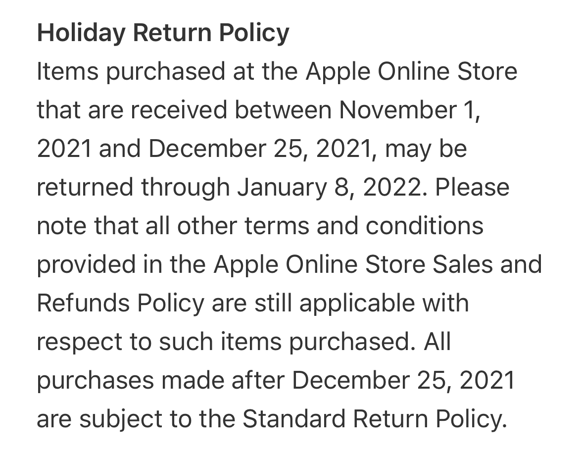In some countries like Italy and Spain, most items purchased between November 1, 2021 and December 25, 2021 may be returned through January 20, 2022.Items purchased at the Apple Online Store that are received between November 1, 2021 and December 25, 2021, may be returned through January 8, 2022. Please note that all other terms and conditions provided in the Apple Online Store Sales and Refunds Policy are still applicable with respect to such items purchased. All purchases made after December 25, 2021 are subject to the Standard Return Policy.