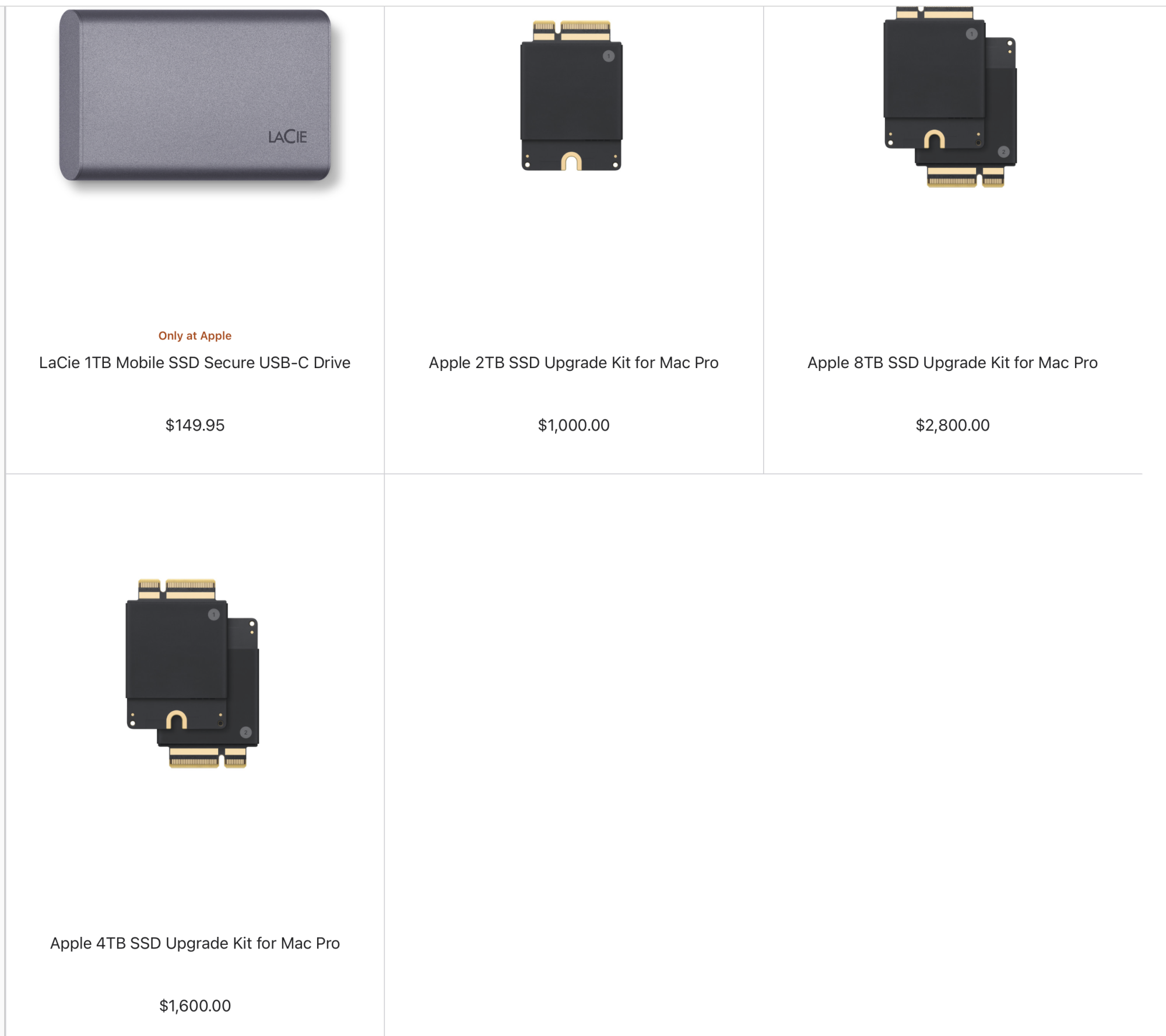 Those are propreitary sized and shaped internal storage, not industry starndard sized and shaped internal storage that was used in literally every Apple desktop computer and every Apple laptop computer (except the MacBook Air) starting with the transition to hard drives with the Macintosh SE in 1987, up until shortly after Tim Cook became CEO. What does that say about Cook's corporate greed?The Mac Pro's primary storage is slotted, not soldered. And while you have to pay Apple's prices, that storage is upgradeable. From apple.com (ignore the LaCie):
