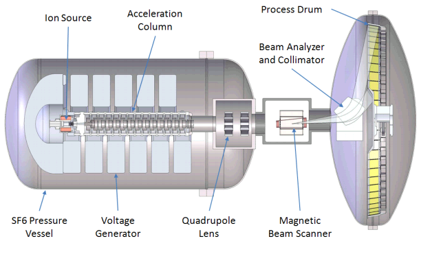 I got interested, dug around, and apparently you're bang on. As you said, the ions are focused by an electromagnet onto the spinning wafers cooled by water.