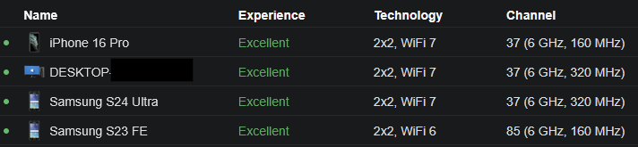 My household runs off WiFi 7 APs with a full 2.5gbe backbone. Honestly, it's glorious. Here's a glimpse of a few devices and their channel usage: