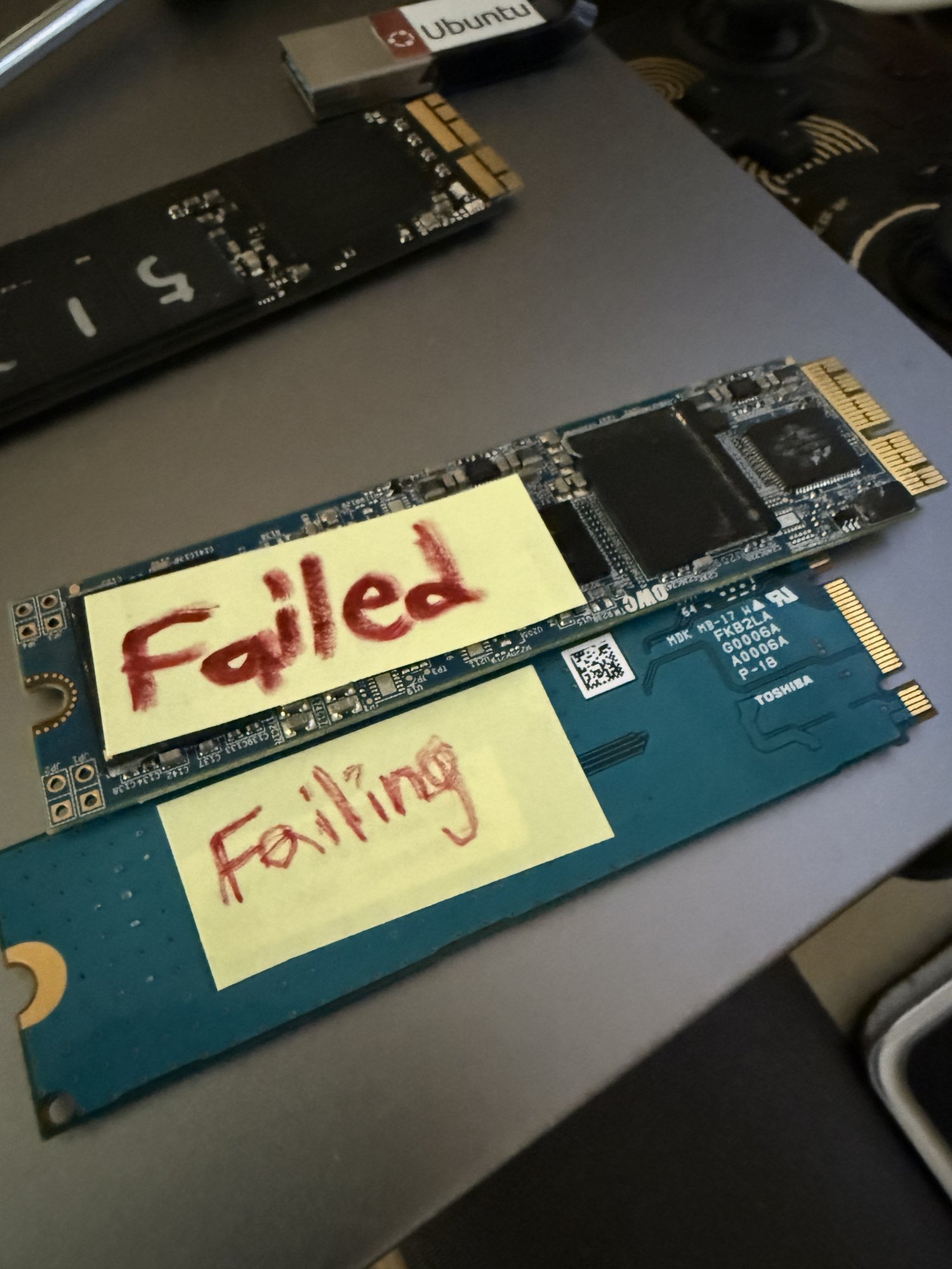For the above Mac storage, I can't say for sure if they were worn out, or failed for other reasons. Many MacBooks have an issue where power can jump on the rails and fry the SSDs. This is a known defect that Apple has yet to fix, and it's not related to wearing out of the drives.