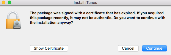 https://support.apple.com/HT208079 and tried to install it. First I got this message about the certificate being expired, but the installation continued and was successful.
