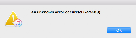 Starting iTunes, I got “An unknown error occurred (-42408)” then, when I tried to log in, I got “An unknown error occurred (-50)” and again (-42408). I was unable to log in after multiple attempts. On another account on the same installation that was logged in, iTunes displayed the same -42408 error message.