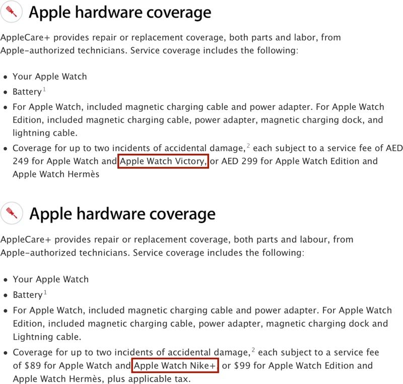 An AppleCare+ support page for the United Arab Emirates, shared by 9to5Mac, mentions AppleCare+ options for the "Apple Watch" and "Apple Watch Victory," a product that does not exist.