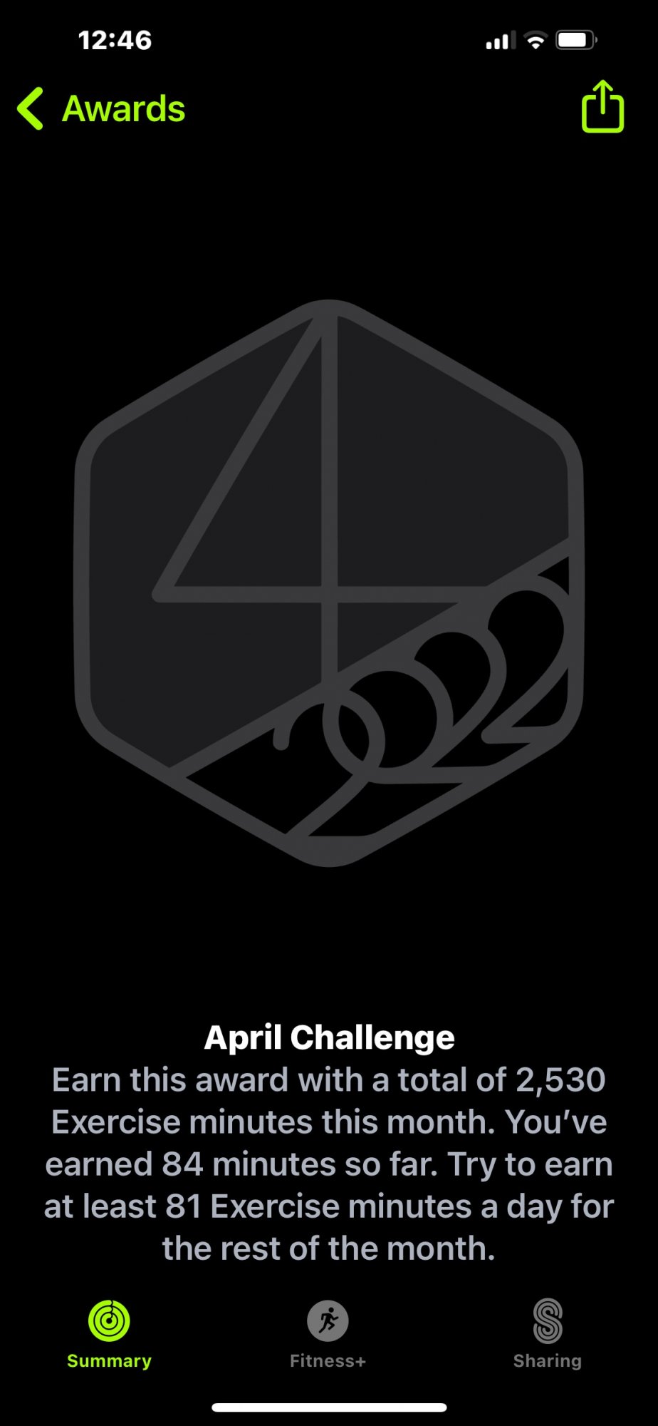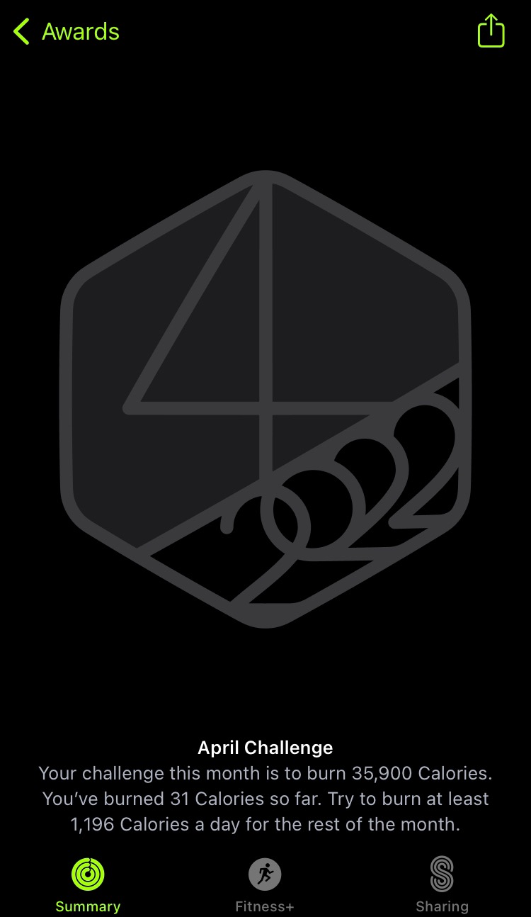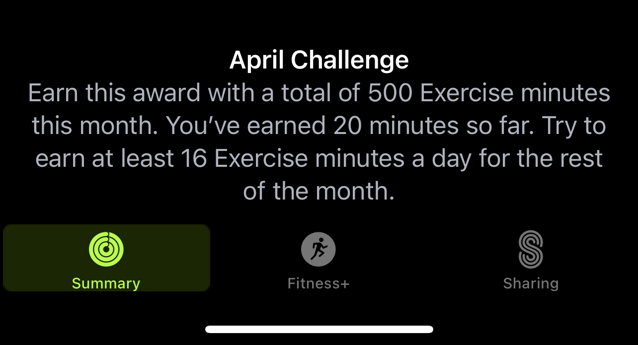 That's pretty intense (more than two hours a day in March)! Hope that the COVID didn't hit you too hard. I had COVID about a year ago and was pretty beat up by it and still can sense many smells. I had a similar challenge in March, 2080 minutes, that I completed with a total of 2480. This month I got this:I got COVID and failed last month so hoping for better luck this time. Interesting to see what difference that one failure makes - I had exercise minutes in February too, but 3810 then compared to this month’s 2890.