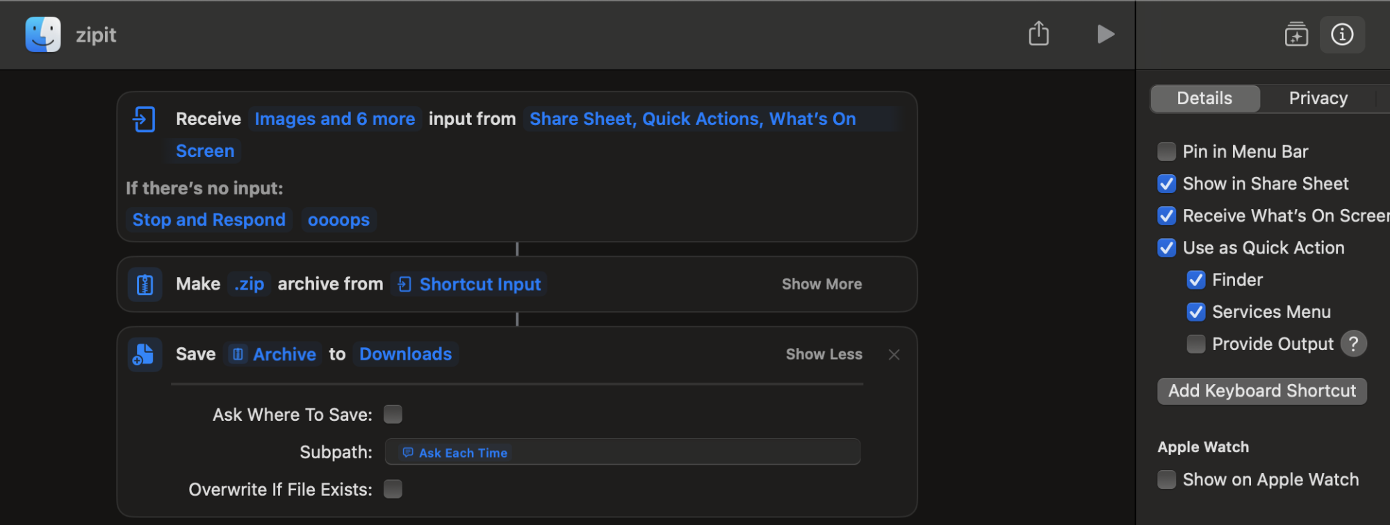 I want the archive of any folder I compress to be saved to my Downloads folder, NOT the directory the folder is in. So I changed the appropriate setting in Archive Utility, yet it's still saving the archive to the same directory as the folder and not in Downloads. What am I doing wrong?