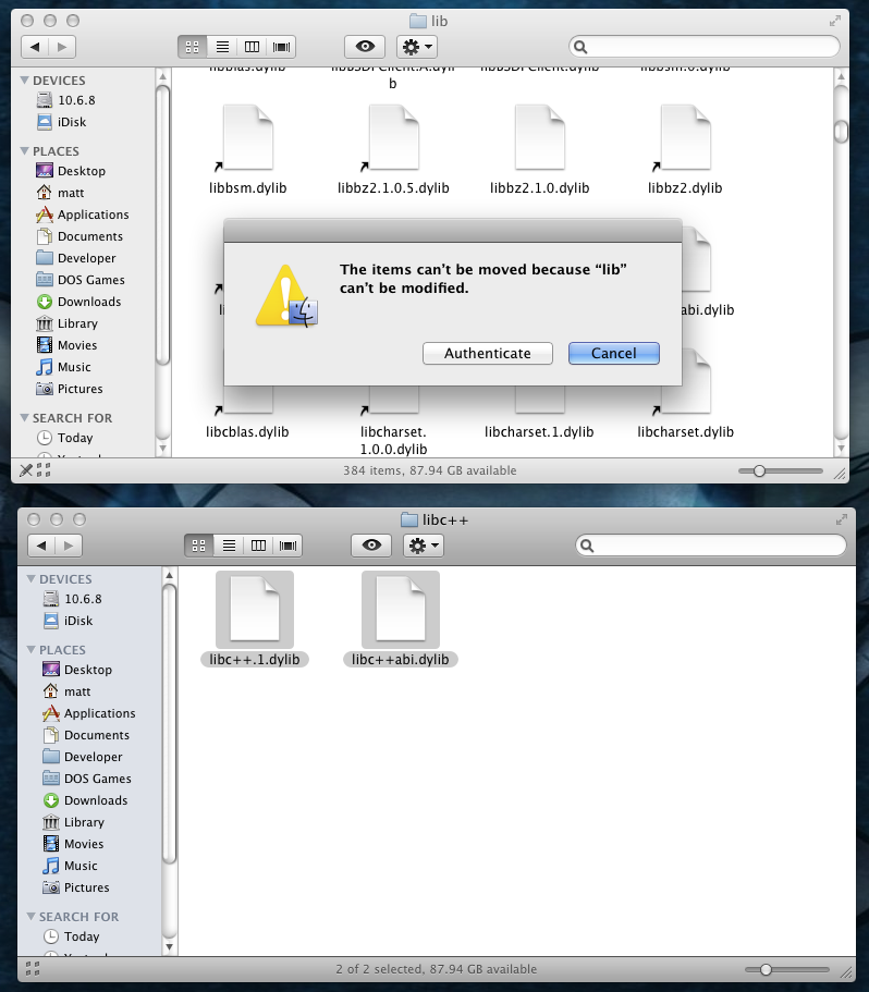 Then open the folder that contains the 2 dylibs and drop and drag them in to the /usr/lib folder. It will ask to "authenticate", click it (and enter admin password if it asks).