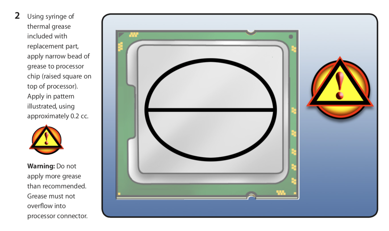 I am planning to replace my CPU on my Mac Pro 5,1 and I wonder how much Arctic thermal paste ARCTIC MX-4 2g I should place on my new CPU? I saw some people on videos placing a dot in the centre or a line from side to side,....Any advice what is the best way? And I also wonder when screwing off the towers do I need to count the cycles of each screw and do the same when screwing them back on? since I read that with the Mac Pro 5,1 when you unscrew them the tower will kind of pop up and when you screw them back you will notice once it stop, so you don't need to count turns. Any advice?