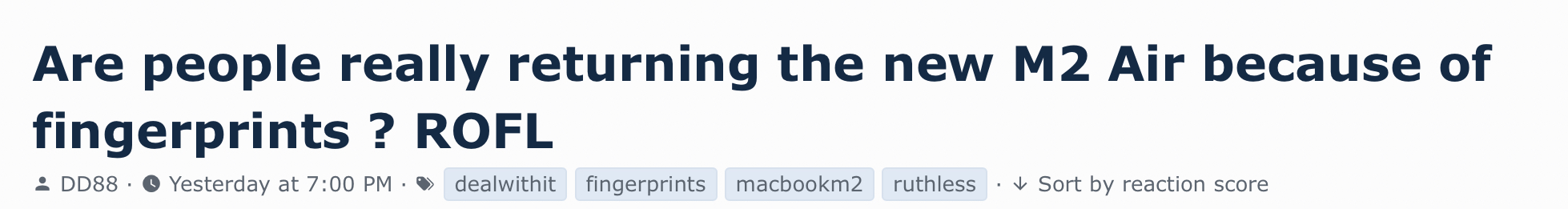 As a general rule of thumb, treat anything negative on Macrumours as a very vocal minority which is not representative of real-life sentiment. That is, assuming the posters are even being honest about having bought an M2 MBA to return in the first place.