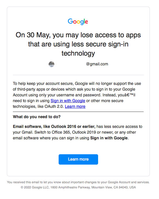 OAuth 2.0 a mandatory function of accessing one’s Gmail email from outside the (heavy) confines of the Gmail web page, effective 30 May 2022: