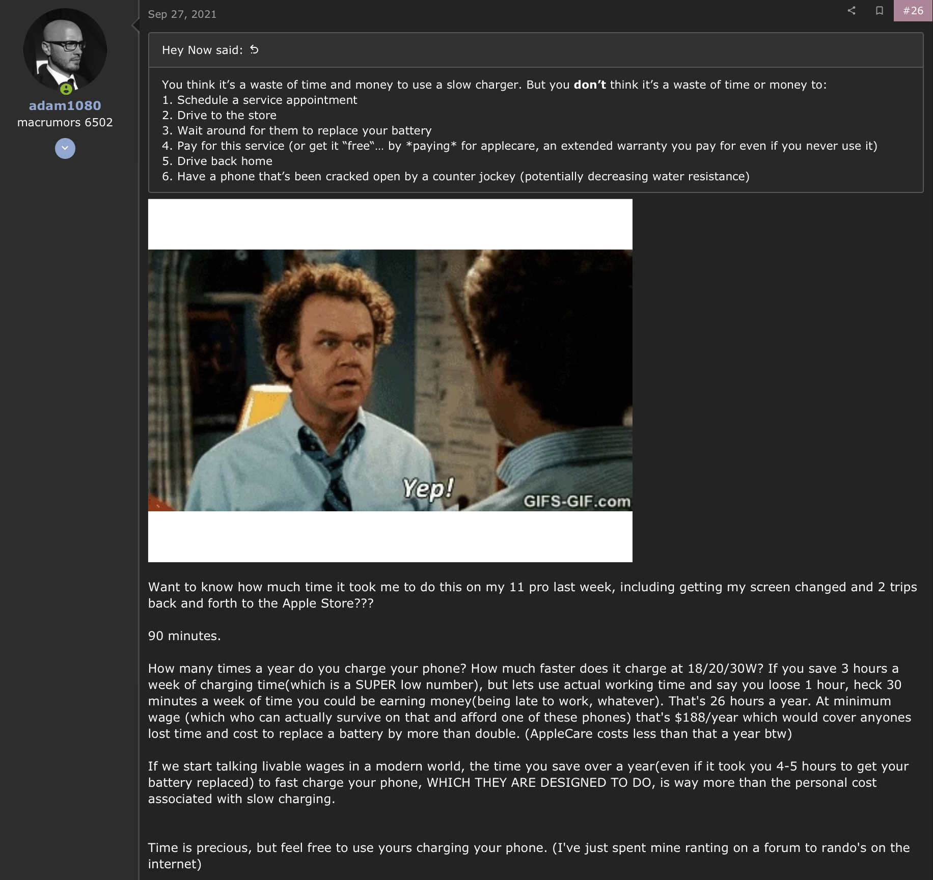 But ultimately "to each their own." If people's kink is worrying about how they charge a new phone that could be replaced FOR FREE if their worst fear of poor battery health occurs, then who am I to judge? Plenty of people out there do dumb things that don't affect me at all, why should I care?
