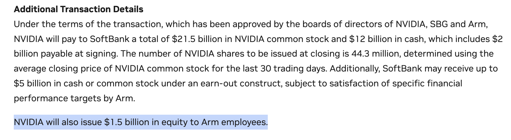 - Stock options/grants. ARM employees hold shares of ARM - which is usually how tech companies add additional compensation without using cash. Those shares would have been converted to Nvidia shares.