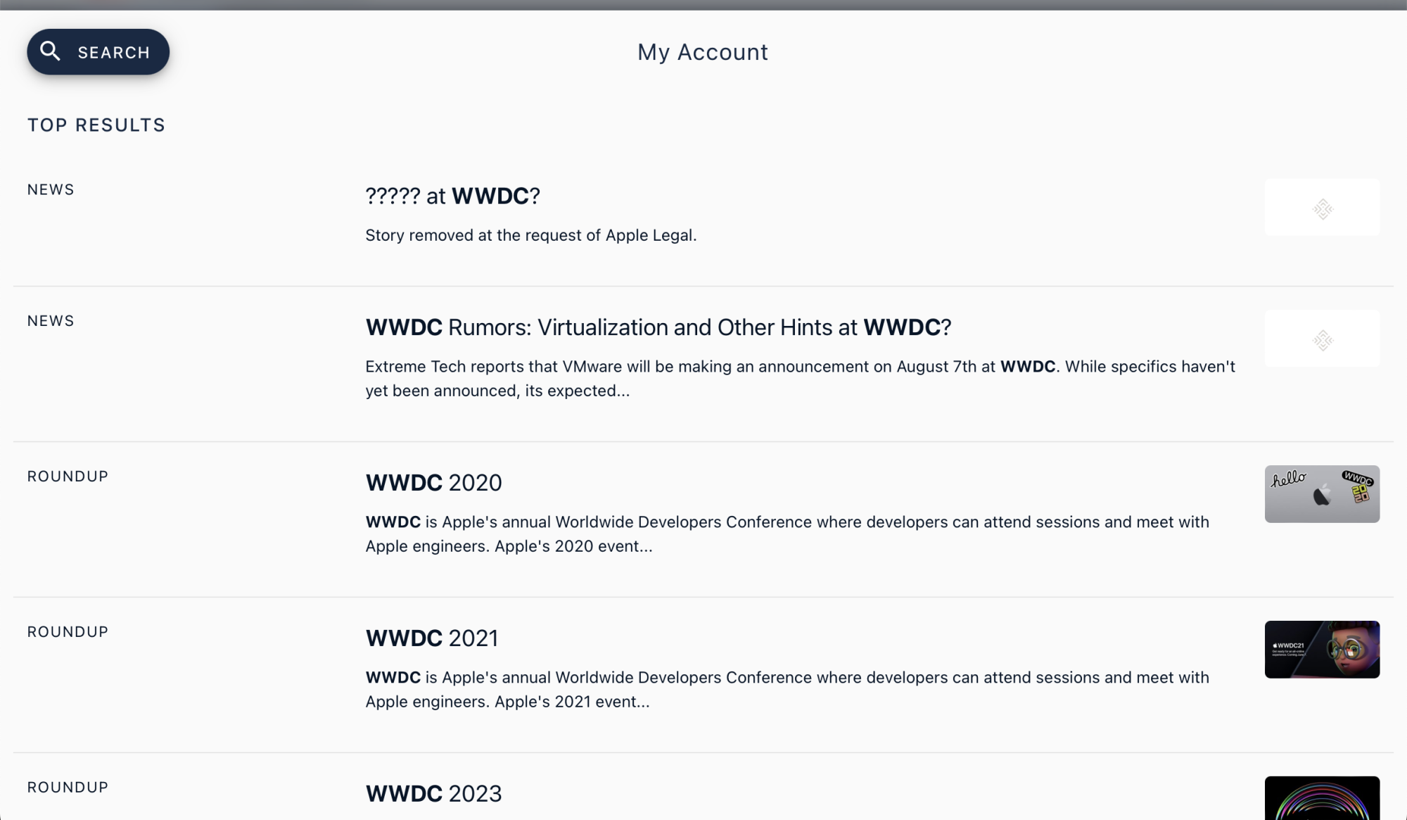 I just went to search from the front page for "WWDC" to see when it is this year. The results were all over the place, and most of them dated. The first one was a redacted article from like 2003, and the second one was from 2006! There doesn't seem to be any option to sort the results in any way, either.