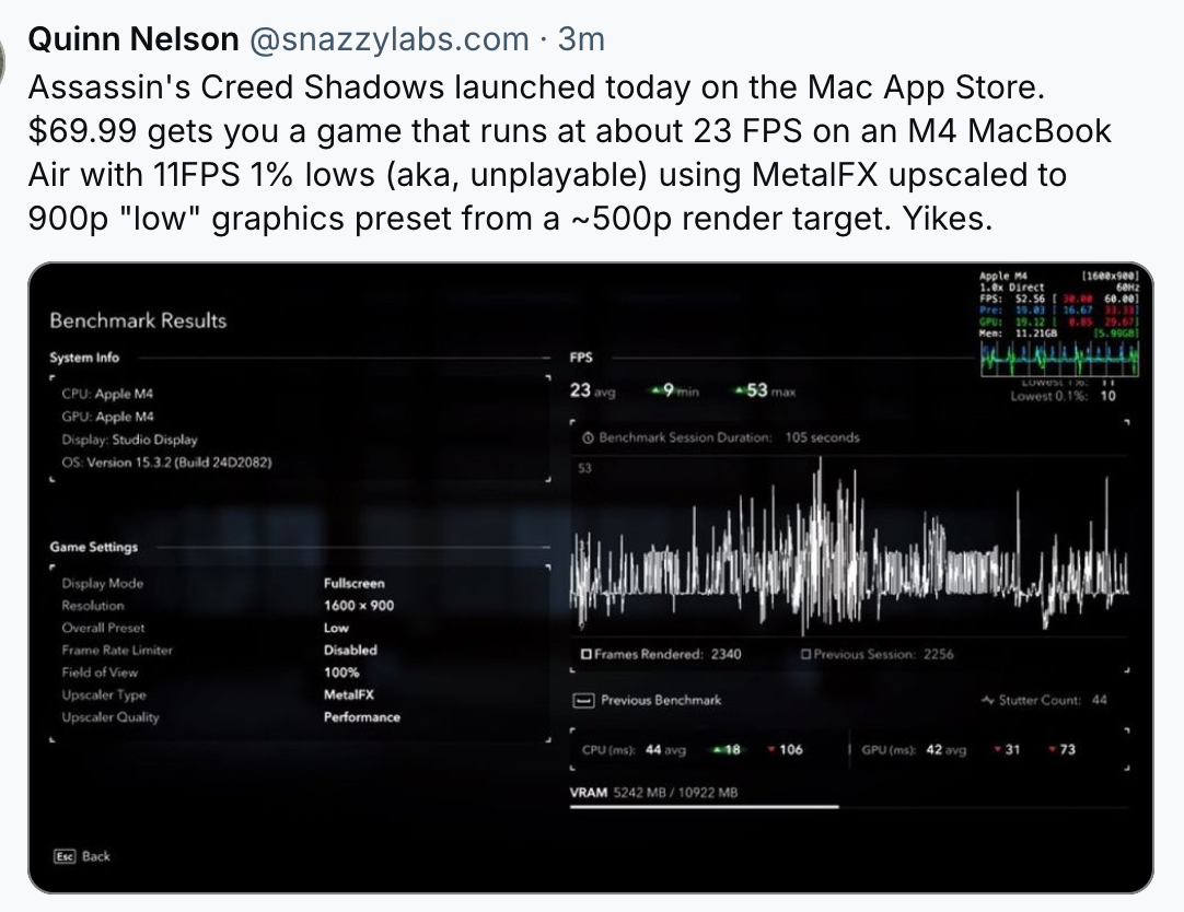 I’m probably going to buy this. I’m not a huge gamer and my only gaming machine is a Switch, but it’s great to see some AAA titles coming to Mac. I’m really enjoying Prince of Persia: Lost Crown. The graphics on my Mac Mini M2 Pro are impressive compared to my Switch and anything on iOS.