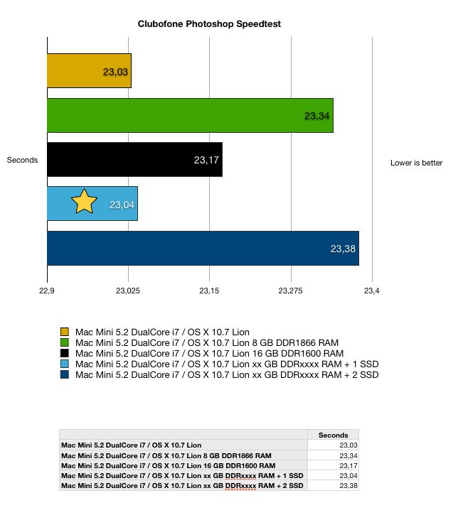 Their Medium test shows that it's faster than a MacBook Pro Quad Core 2011 2.3GHz using 80% of it's memory (mine was set to use 100% wich apparently was a bad idea, can according to digilloyd get better results with only 70-80% RAM usage?!).