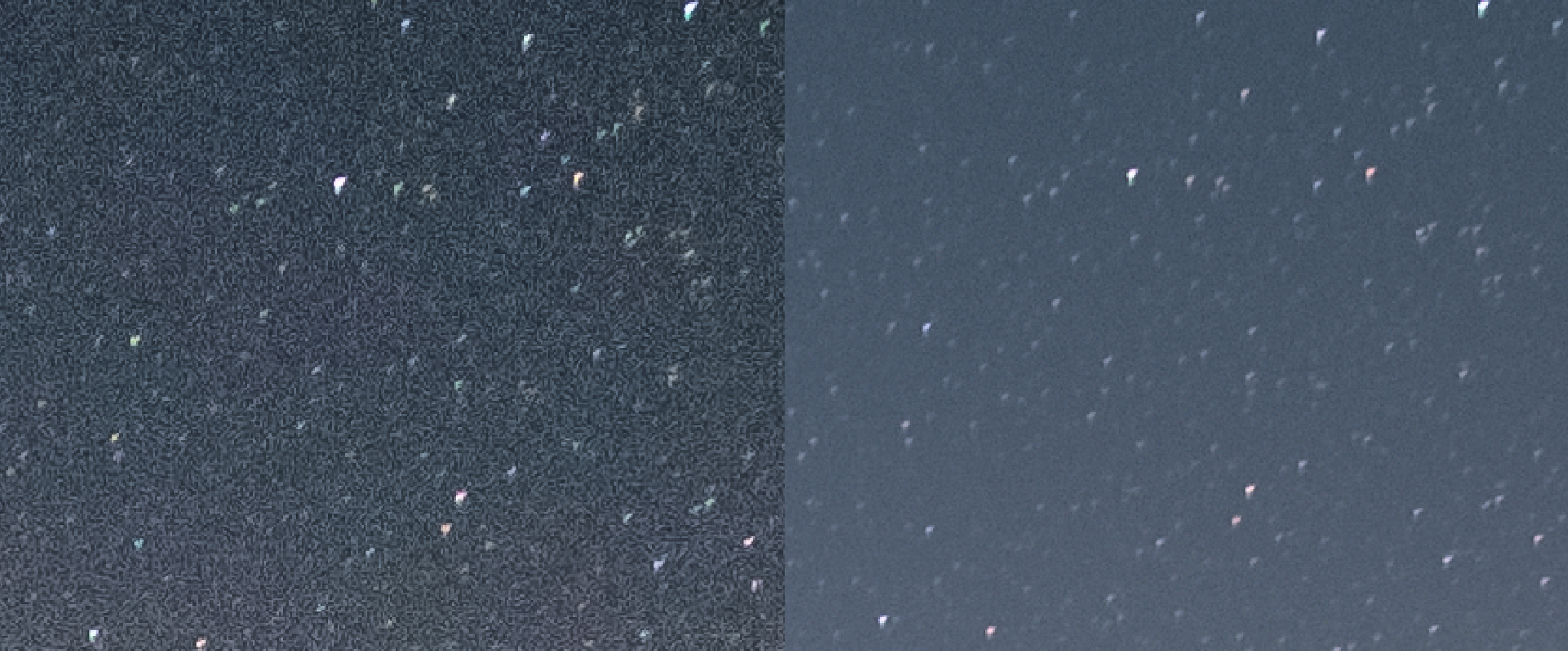 For any night sky information, http://www.lonleyspeck.com is the place to look. I first attempted night sky photography back in 2004/5 but the equipment I had then wasn't suitable. I had to wait until technology in cameras became a lot better! My stacking technique uses Starry Landscape Stacker, a macOS only program priced at around £40. It's great for images that don't have anything intricate sticking above the horizon, like trees. Uninterrupted horizons stack better with it. There is a huge difference in noise reduction, below is an unedited sample zoomed in from my XT2 shot at ISO 6400. I can't remember the magnification, but it gives you an idea. Once the stacked TIFF is ready, I'd then edit it. The stacking to reduce noise makes a big difference when printing.