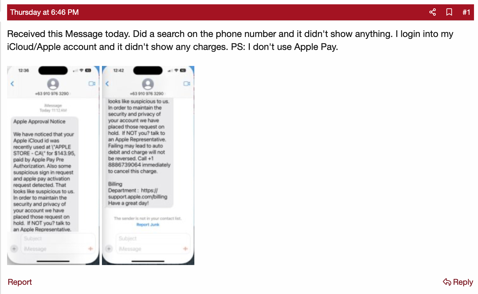 Received this Message today. Did a search on the phone number and it didn't show anything. I login into my iCloud/Apple account and it didn't show any charges. PS: I don't use Apple Pay.