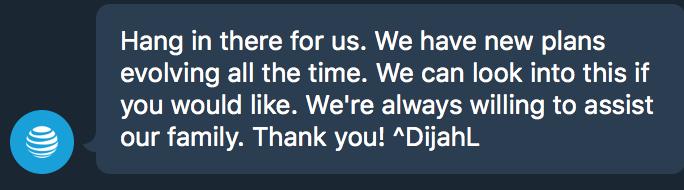 HAHA! Every time I spoke with AT&T CSRs, they really didn't want to keep me as a customer even though I had been with them for 10 year and was a "Platinum" as part of their Thanks program (and had paid them in excess of $25k over that time).Was in response to me asking if they are able to put together custom packages to retain customers who want to leave. The reply was through direct messages on twitter.