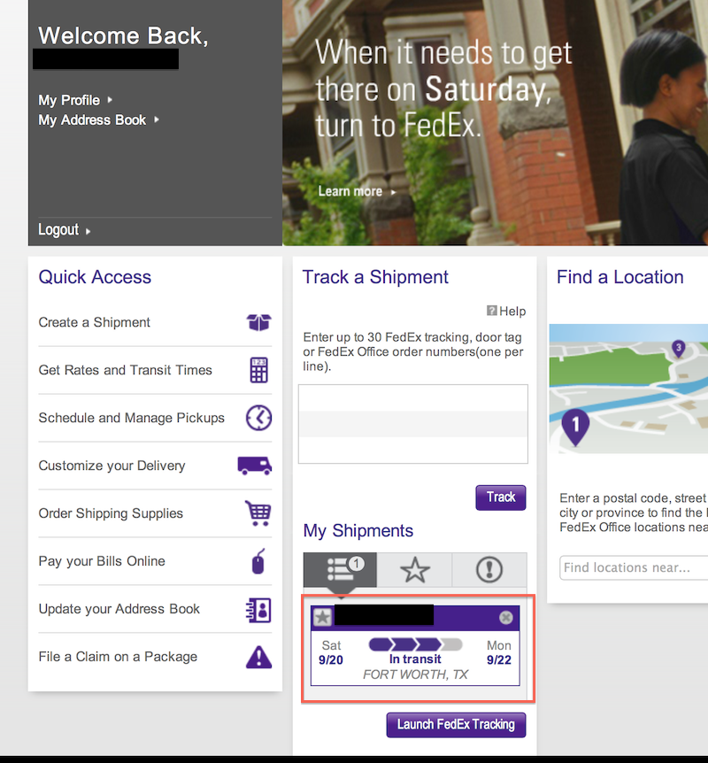 Shipped via FedEx at 4:33 PM EST on 09/20/2014 from Texas