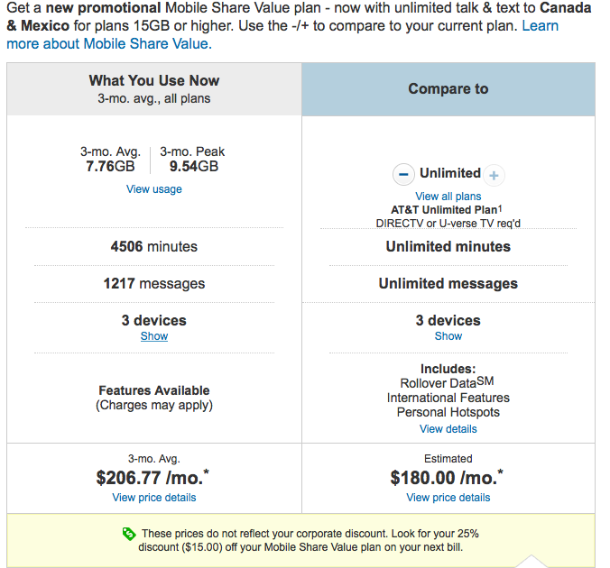 MOBILE SHARE VALUE PLANS: Prices shown are for plans currently offered to new and existing customers. Above may not reflect promotional or retired plans. Prices are for service only and include monthly plan charge & per device monthly access charge. Devices: Sold separately. AT&T Next installment charges and other device purchase costs are extra. Data Overage: If you exceed the amount of data in your plan or other allotments during your billing period, additional data will automatically be provided in increments of 300MB at $20 per 300MB on a 300MB plan, or 1GB at $15 per GB. Unless otherwise specified, data allowances, including overages and Rollover Data, must be used in the billing period provided or they will be forfeited. Data: Tethering and Mobile Hotspot use for up to five (5) simultaneous devices. Authorized users on the account may temporarily suspend data access for each device on the plan. Data access will be restored at the beginning of the next billing cycle. Monthly charges will continue to apply. Rollover Data: Unused data from the monthly plan allowance rounds up to the nearest MB and carries over for one billing period. Rollover Data automatically expires after one billing period or with any plan change (such as changing data amounts or termination). Rollover Data is used after your monthly plan allowance. Mobile Share and Mobile Share Data-only plans are excluded. Eligibility: Available to consumers and IRUs. For full service terms and conditions see visit att.com/wirelessterms. Device Limits: 10 per plan. Limit on the number of financed devices per wireless account applies. UNLIMITED TALK: For phones only. Includes unlimited calls within the U.S., Puerto Rico, and the U.S. Virgin Islands (Domestic Coverage Area). Svc may be terminated for excessive roaming (see Wireless Customer Agreement at att.com/wca). Unlimited Talk to Canada and Mexico: Only included on the current Mobile Share Value plans 15GB and above. For phones only. Includes unlimited International Long Distance (ILD) calling from Domestic Coverage Area to Mexico and Canada only. You may be charged for calls to special or premium service numbers. Calls to Other Countries: plans also include ILD service which can be used to call countries other than Canada and Mexico. Per minute pay-per-use rates apply unless an ILD service package is added to the line placing such calls. Rates subject to change without notice. For rates, see att.com/worldconnect. UNLIMITED TEXT: Standard Messaging– For phones only. Includes unlimited number of messages up to 1 MB in size within and from the Domestic Coverage Area to more than 190 countries for text messages and 120 countries for picture and video messages. AT&T may add, change, and remove included countries at its discretion without notice. Messages sent through applications may incur data or other charges. Visit att.com/text2world for details. Advanced Messaging – For customers with Advanced Messaging capable devices only. Both sender and recipient(s) must be AT&T postpaid wireless customers with HD Voice accounts, and both must have their devices turned on and be within AT&T's owned and operated Domestic Coverage Area (third party coverage is excluded). Includes unlimited number of messages up to 10MB in size. Additional rest's apply and can be found at att.com/advancedmessaging. Wireless Home Phone ("WHP"): is a wireless voice service (CMRS). Wireless Home Phone and Internet ("WHPI"): is a CMRS & mobile broadband Internet access service. Plan 15GB or higher required. WHP & WHPI General:Messaging excluded. For emergency calls, provide location to 911 operator. Devices have backup battery but landline equip. with separate power will not place/receive calls (including 911) during outage. Not compatible with landline dependent services like medical alert monitoring systems. Other compatibility limitations apply. For WHP details visit att.com/getwirelesshomephone and att.com/getwirelesshome for WHPI details. Connected Wearables: Is a wireless phone designed to be worn that is capable of making/receiving calls without being connected to another wireless device. For a list of devices visit att.com/wearableslist. Connected Devices:Includes eligible connected vehicles, cases, and other select devices. IRU: Service discount described in your organization's AT&T business agreement is available only for Mobile Share Value Plans 2GB or higher. Discount applies only to the monthly plan charge, and not monthly device access charges. GENERAL WIRELESS SERVICE TERMS: Subject to Wireless Customer Agreement found at att.com/wca. Service is not for resale. If AT&T determines your use of the services violates any of the applicable terms or polices found in the Wireless Customer Agreement, we may in our sole discretion suspend, modify, terminate, or restrict your service. Excessive Usage: You get an off-net (roaming) usage allowance for each service. If you exceed the allowance, your service(s) may be restricted or terminated. Other restrictions apply and may result in service termination. If you purchased a device that requires a term commitment, an Early Termination Fee applies if you cancel service after the first 14 days, and before your term ends. See att.com/equipmentETF for details on what fee may apply for your device and how the fee is prorated over time. Activation/upgrade fee per line (up to $45) and deposit may apply. A fee may be charged if convert from a prepaid or session-based plan or when activate an additional device. Credit approval may be required. AT&T reserves the right to suspend or terminate service to your account, place any non-complying device on an appropriate plan, and/or add any other required element of a plan. Other Monthly Charges: Apply per line and may include taxes, federal/state universal service charges, Regulatory Cost Recovery Charge (up to $1.25), gross receipts surcharge, Administrative Fee, and other government assessments which are not government-