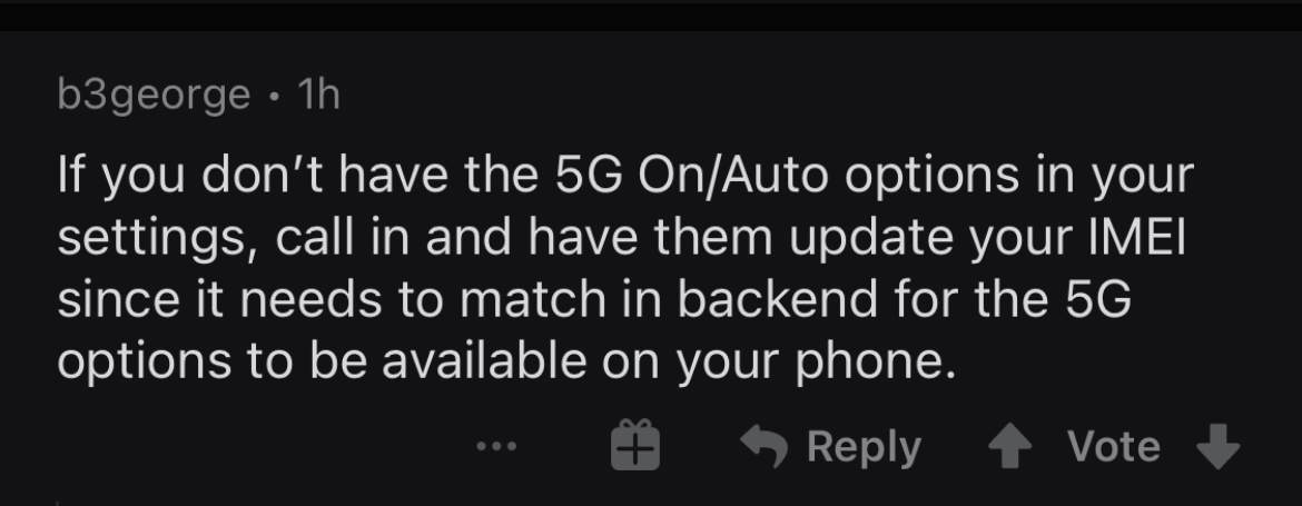 I did this and it didn’t work - what exactly did you say to them in the call and what did they do ? Did you talk to a supervisor? They said they updated my IMEI, but still no 5GI called AT&T and was on the phone with them for an hour. They finally did this and I now have the option for 5G on, 5G Auto, and LTE. I tried 5G auto and 5G on, turned off WiFi and I still get 5Ge. I checked the coverage map in my area and it shows full 5G coverage. Even went outside still no 5G? I do have the new unlimited elite plan as well.