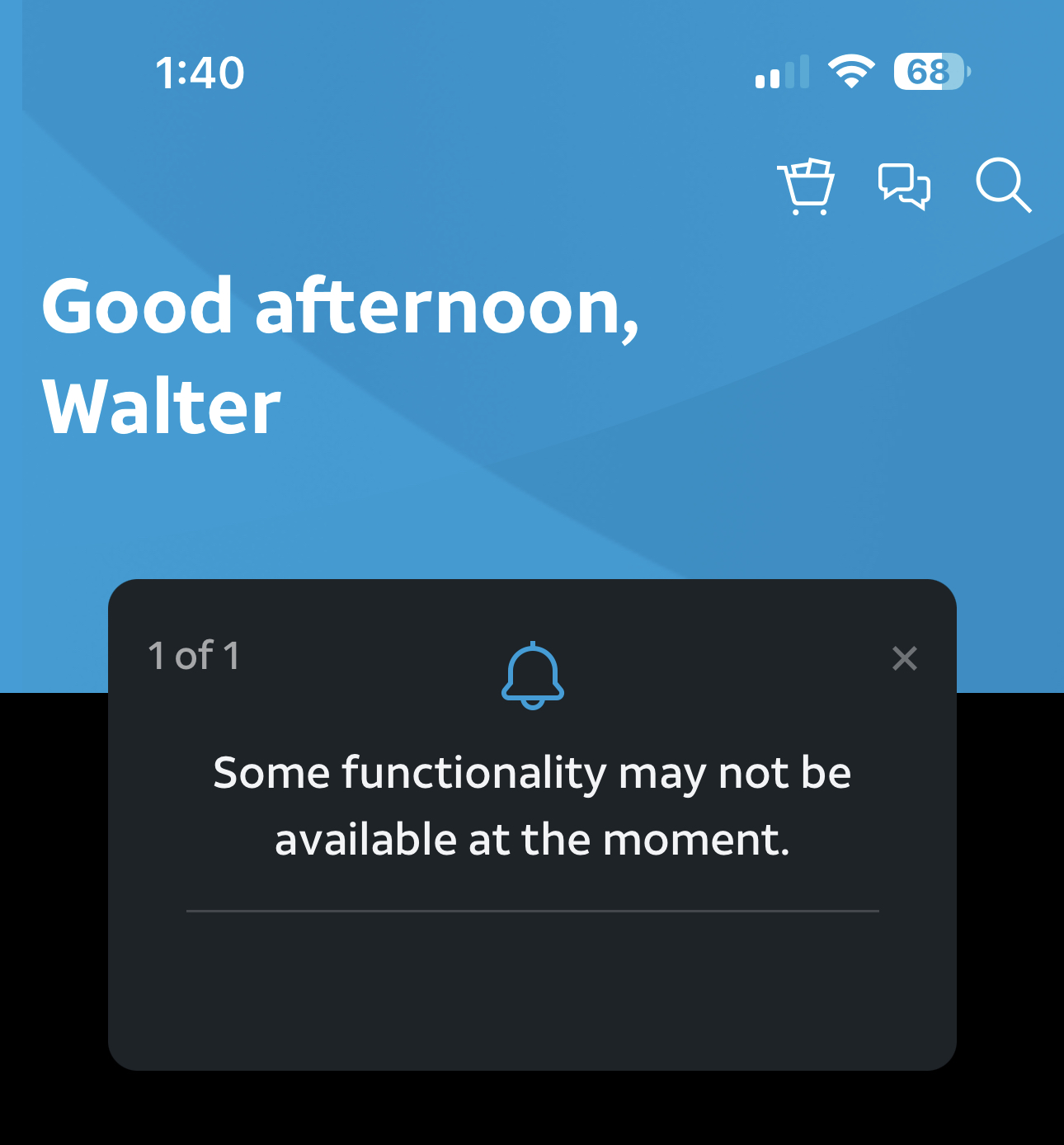 That just means that some back-end system connections are not currently working wait 30 minutes and try again. AT&T is really trying to reset after all the changes they had to make during the day yesterday.This is what I see when opening app.