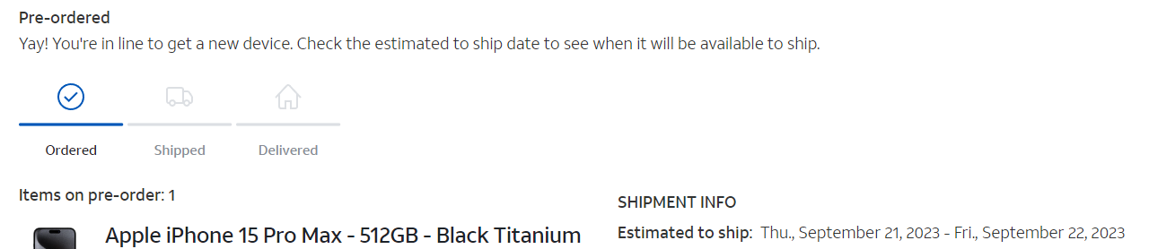 I ordered a 15 PM 512GB on Friday at 8:05 am and on Saturday I received a text that there was an issue with the order. I called and they told me that they don't know why but they have to cancel the order, and I have to re order. They promise that the delivery date will remain the same Friday 22nd, so they created the order over the phone, interesting thing is that even though it was created on saturday 16th, online it says it was created on Friday 15th, and is not the same order, I can still see the previous order with the status of "We canceled your order as you asked" like if it was my choice, what a joke! On Sunday night on the app I am now getting a message that "We hit a snag with your order" Action required, but when I go into the details there are no errors just the Yay! message. My info says Estimated to ship: Thu., September 21, 2023 - Fri., September 22, 2023. I called and they say everything looks great. I have been ordering with ATT for years and things are not improving... I won't be ordering from ATT again.