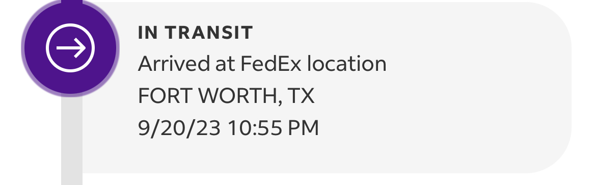 I’m hoping it just hasn’t been updated and that it’ll still arrive today but idk. :/Same here. Its at Fort Worth, but I live in Cali..... My delivery date still says 9/22.