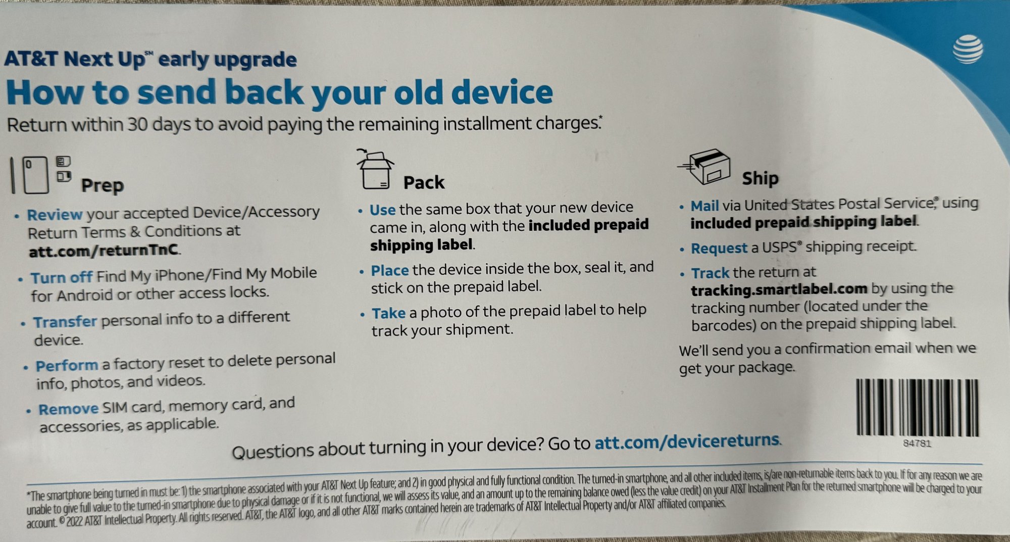 Next Up is different from an ordinary trade. Your instructions are clear, but some folks (including me) have had less clarity with their instructions in the past. Hence, the warning not to inadvertently send the old device to the returns department instead of the trade-in partner.Here are the instructions that came with my new phone. It specifically says to use the same box with the included shipping label. Are you saying we should ignore the instructions provided by AT&T and trust a random poster in this forum?View attachment 2284867